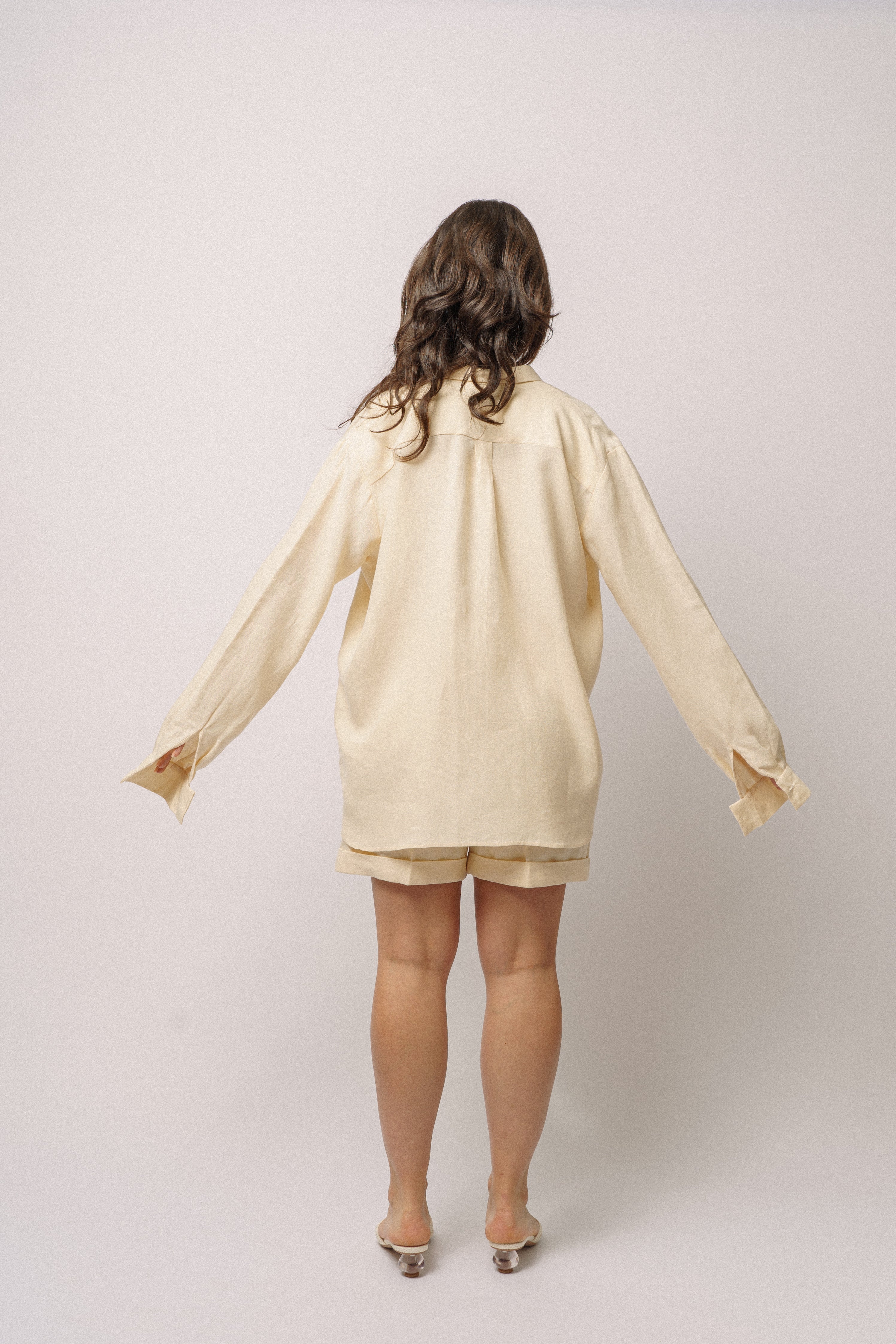 Modelka ve světlém lněném outfitu košile a kraťas ADVA Studios.