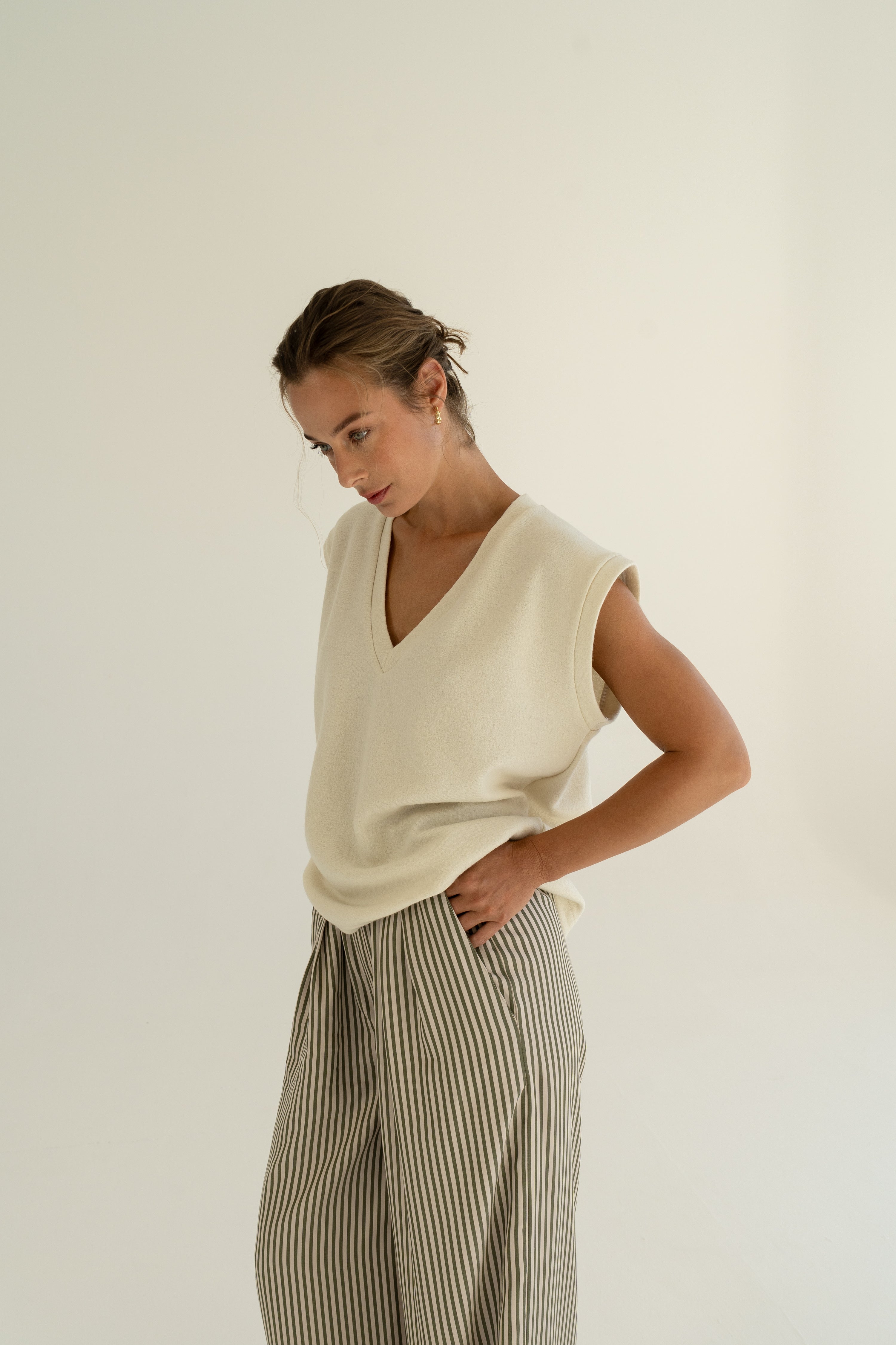 Modelka v bílé vlněné merino vestě a pruhovaných širokých kalhotech ADVA Studios.
