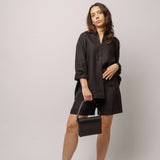 Oversized dámská černá košile a dámské kraťasy z přírodního lnu, značka ADVA Studios.